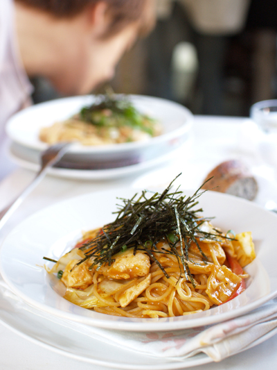 手前、味噌ソースのパスタ、奥たらこソースのパスタ